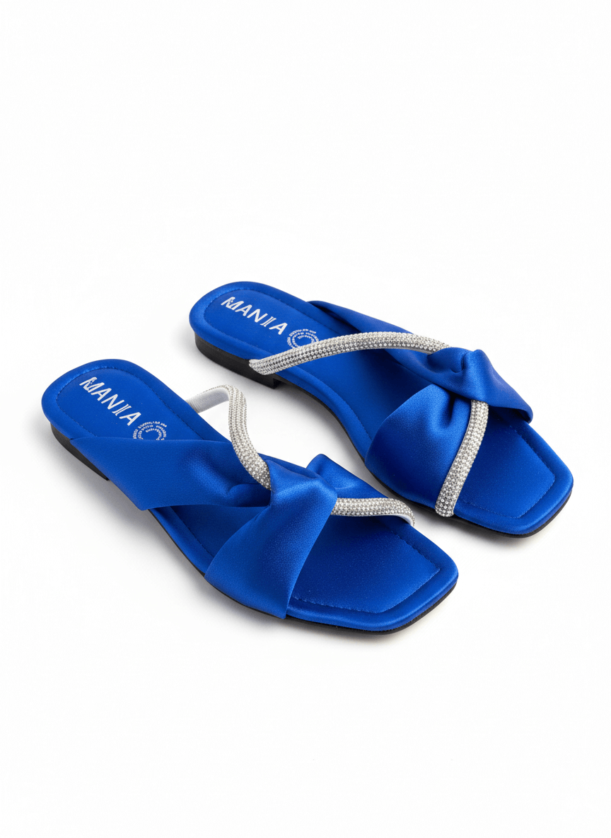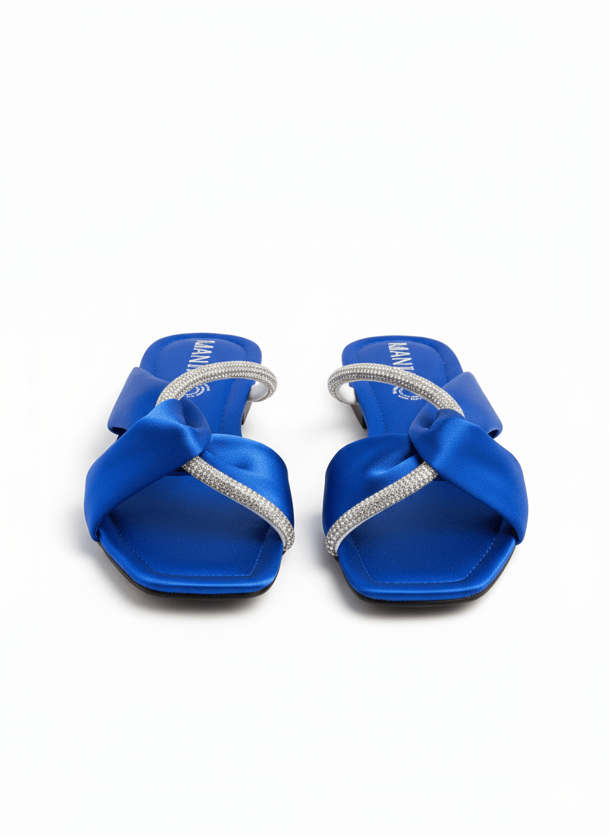 Una sandalia elegante y femenina que combina acabado satinado con tiras decoradas con pedrería. Su tacón plano de 1 cm la hace perfecta para eventos, cenas o para elevar un look sencillo con un toque sofisticado.