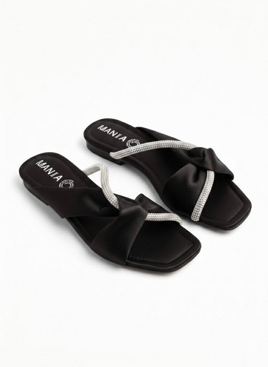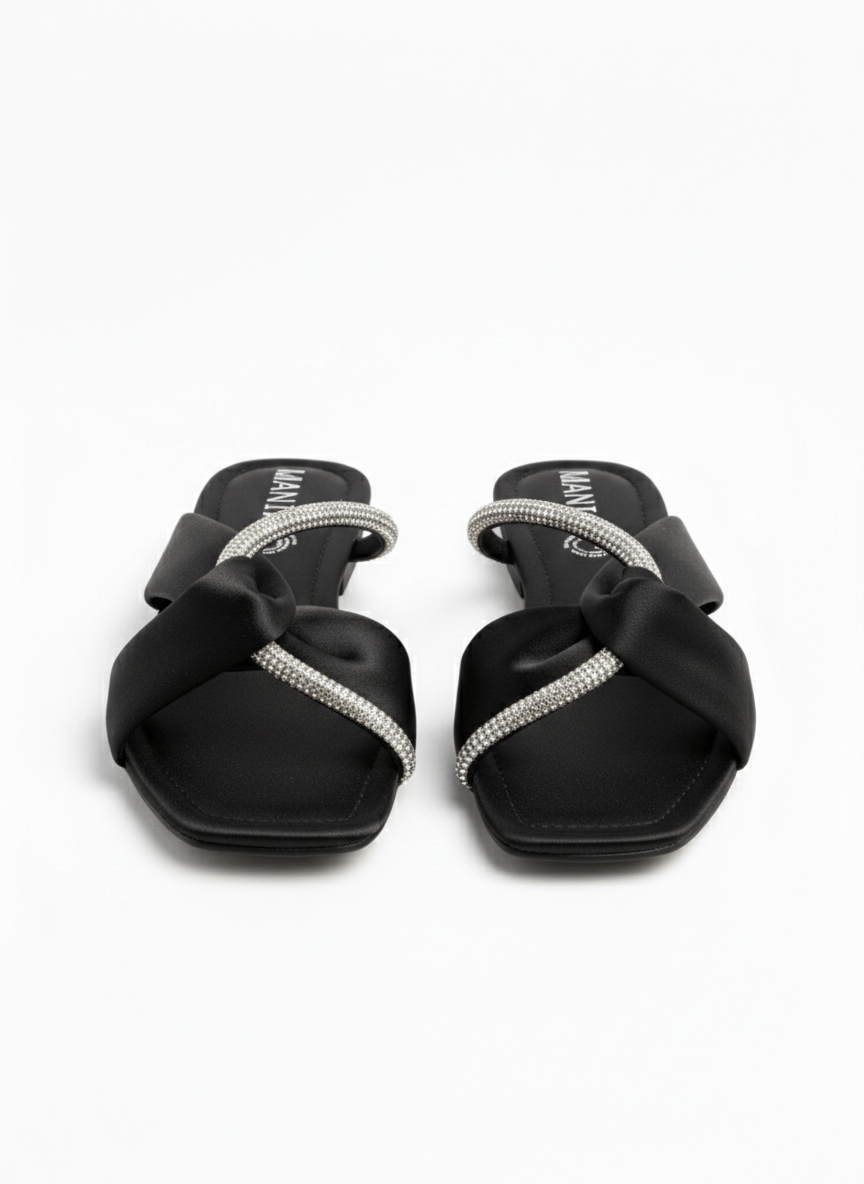 Modelo Ágate – Sandalia plana con tiras brillantes y moño