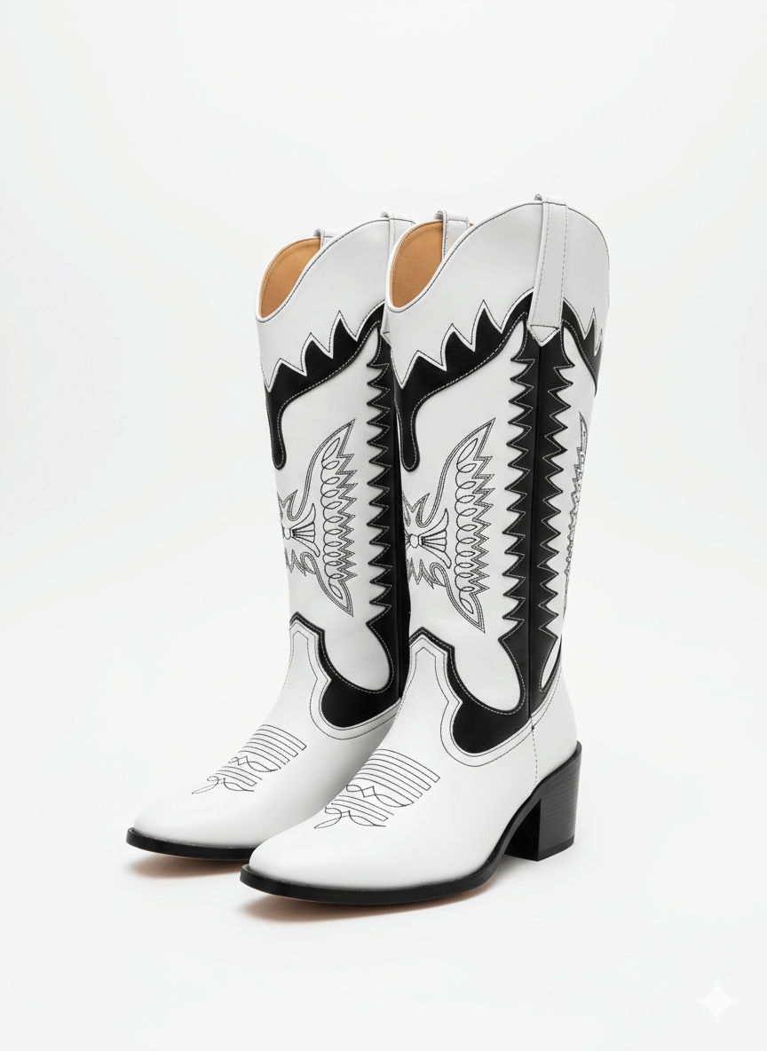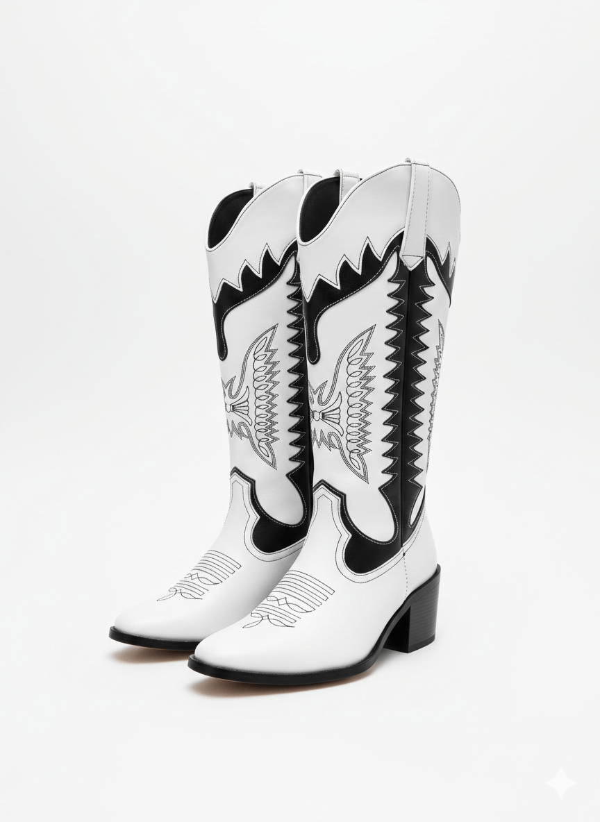 Botas estilo western con tacón de 6 cm en material sintético hecho artesanalmente en México, perfectas para looks casuales con estilo.