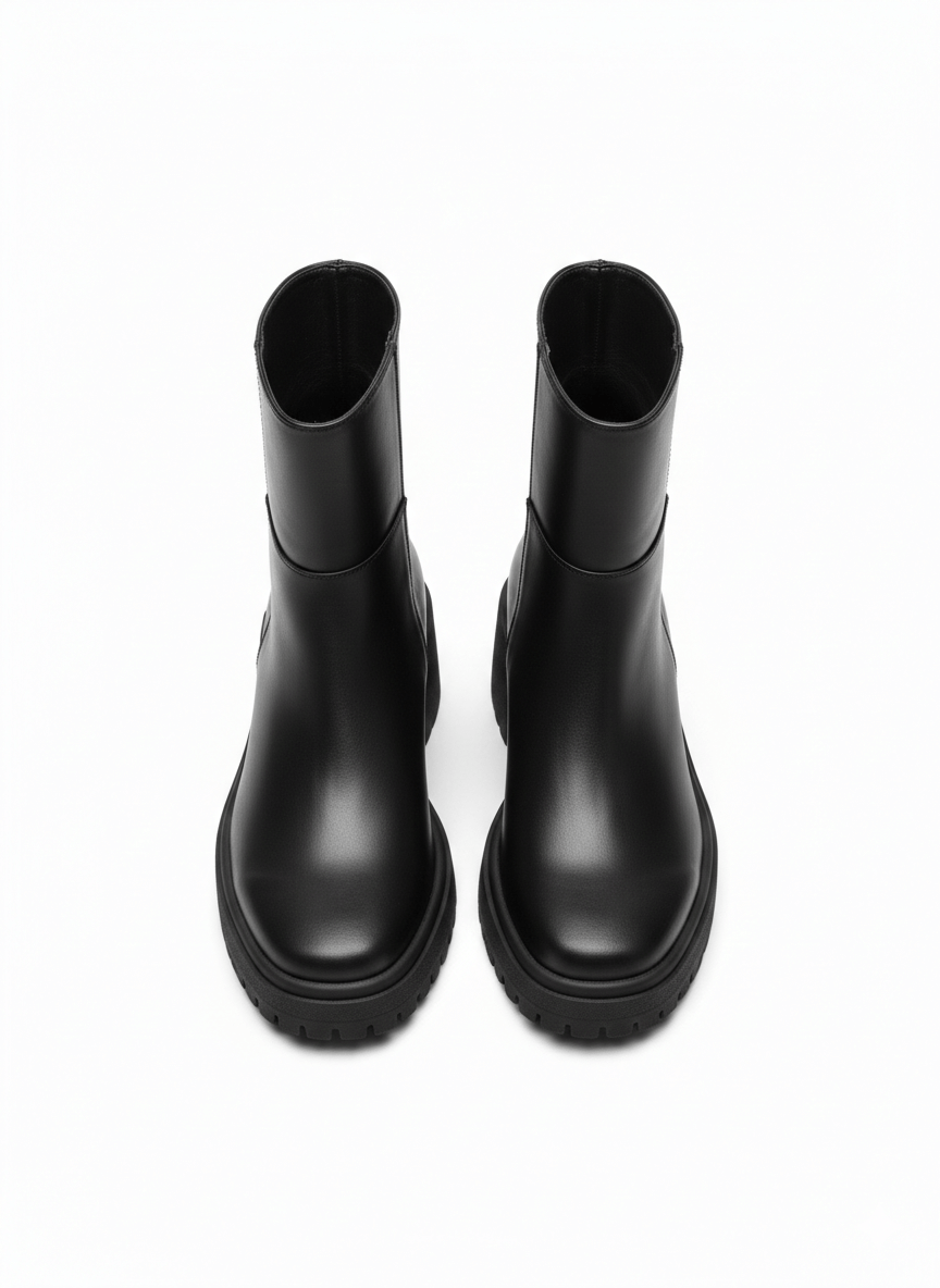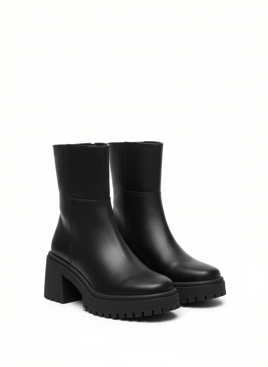 Un botín poderoso y versátil con diseño minimalista y suela chunky. Fabricado en material sintético, con tacón de 7 cmque estiliza sin sacrificar comodidad. Ideal para looks urbanos, casuales o edgy.