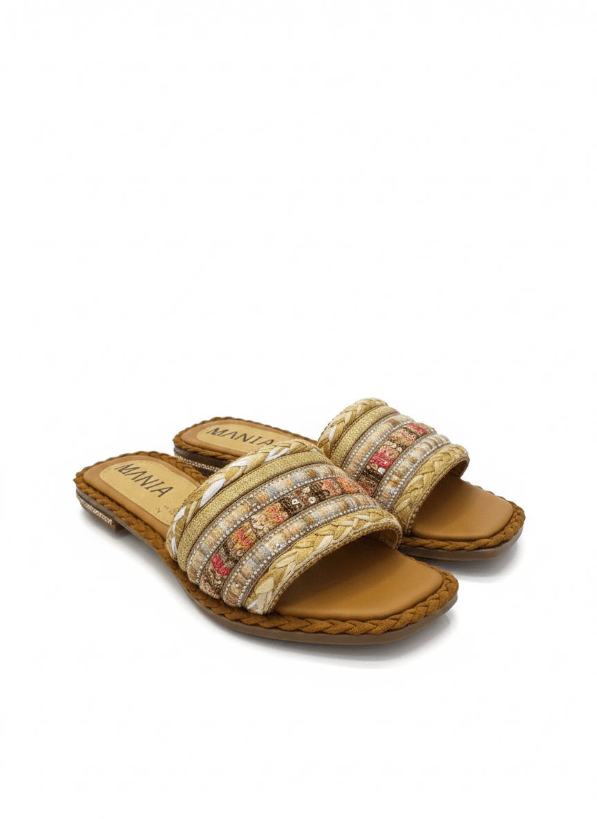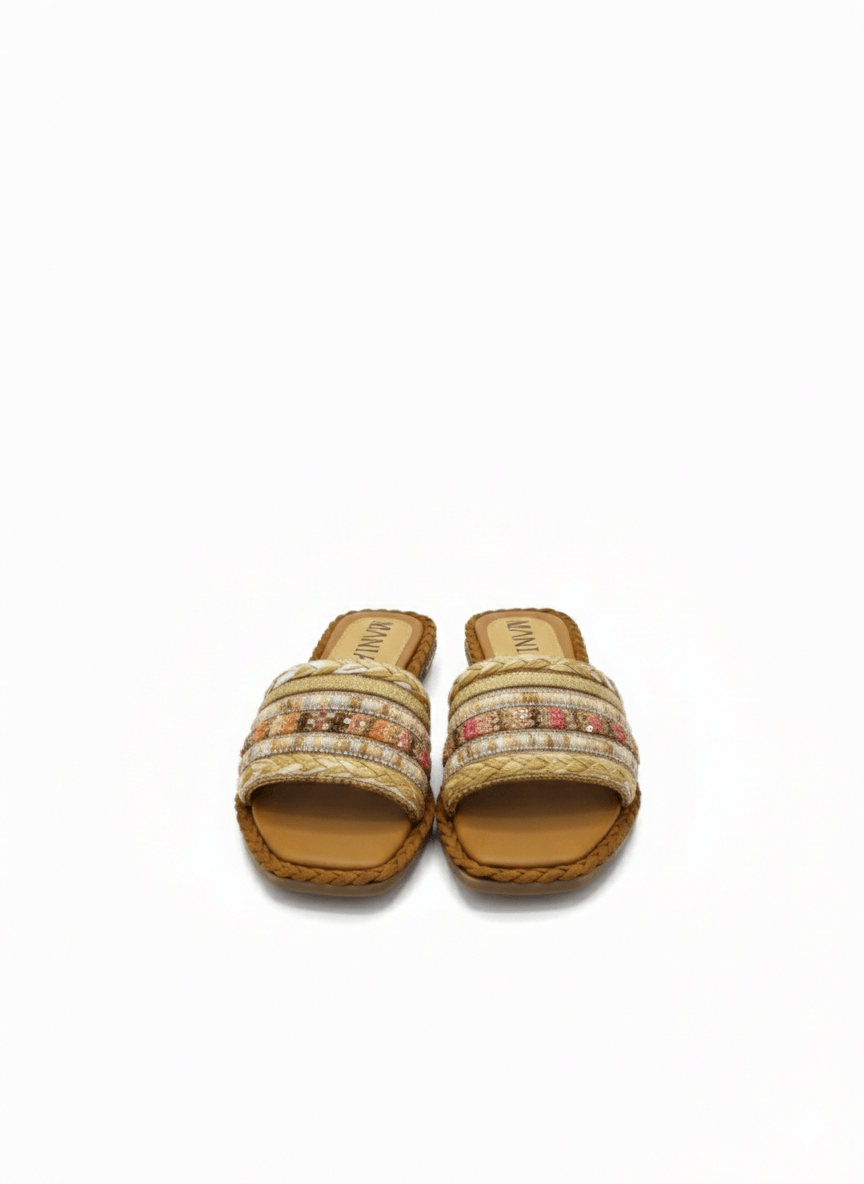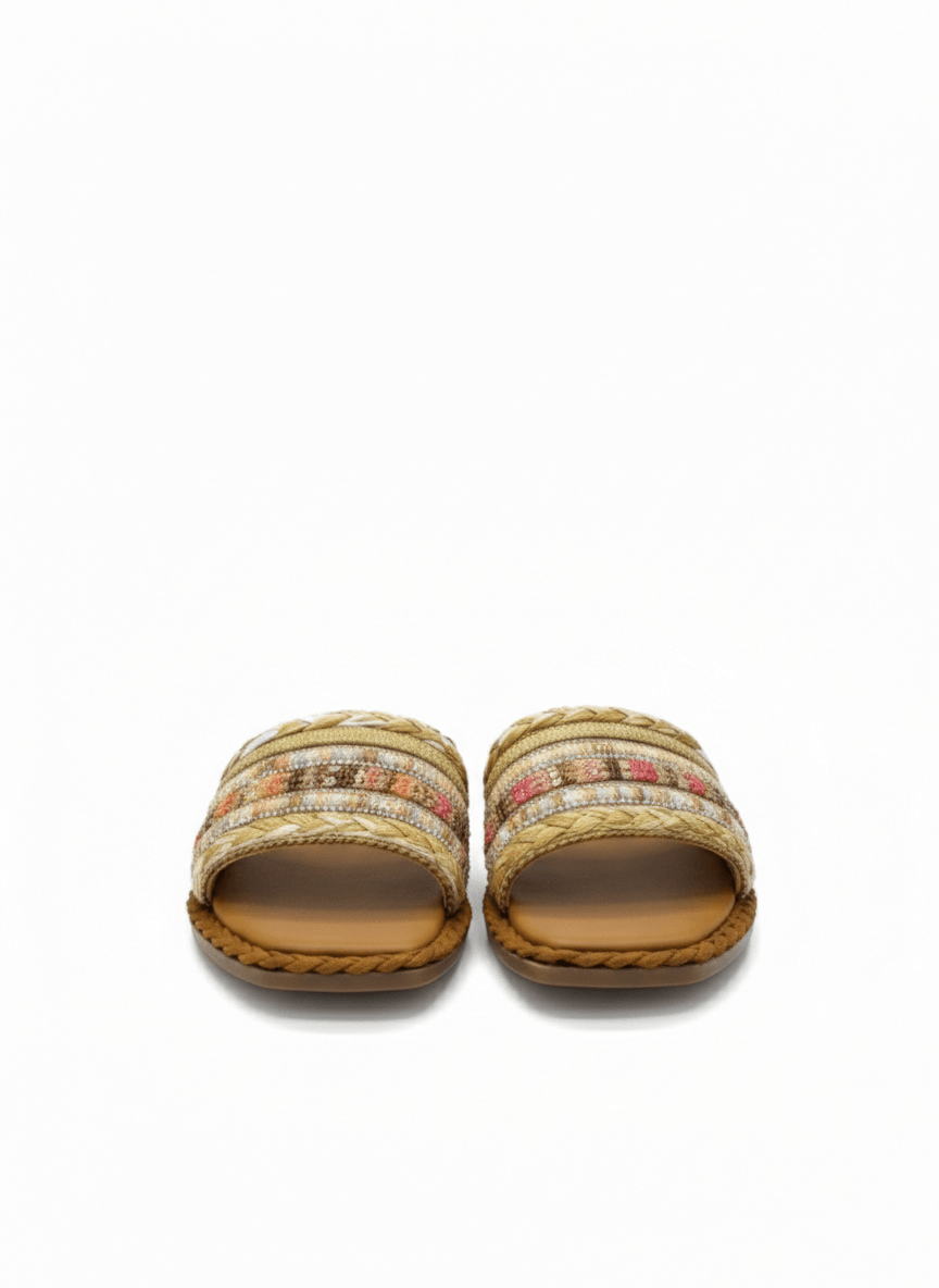 El modelo Creta es una sandalia plana inspirada en un estilo boho y veraniego. Su tira ancha con detalle textil bordado en tonos cálidos aporta un look lleno de textura y personalidad, ideal para elevar outfits sencillos y darles un toque especial.