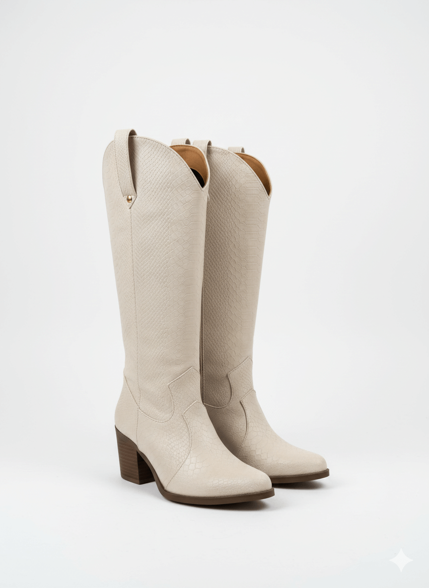 Su corte alto estiliza la pierna, mientras que su tacón de 7 cm ofrece la altura ideal sin sacrificar comodidad. Es una pieza ideal para combinar con vestidos, faldas o jeans ajustados, logrando looks modernos con un aire western chic.